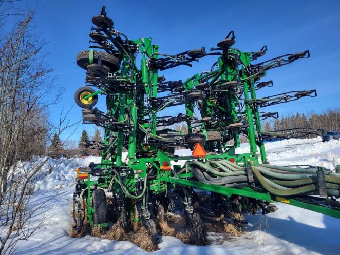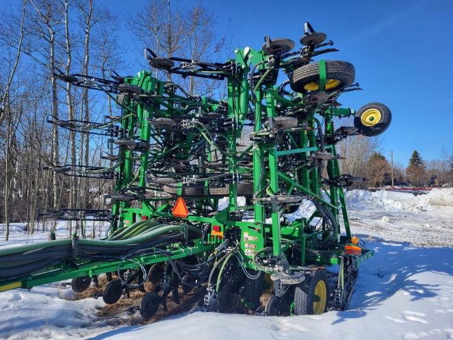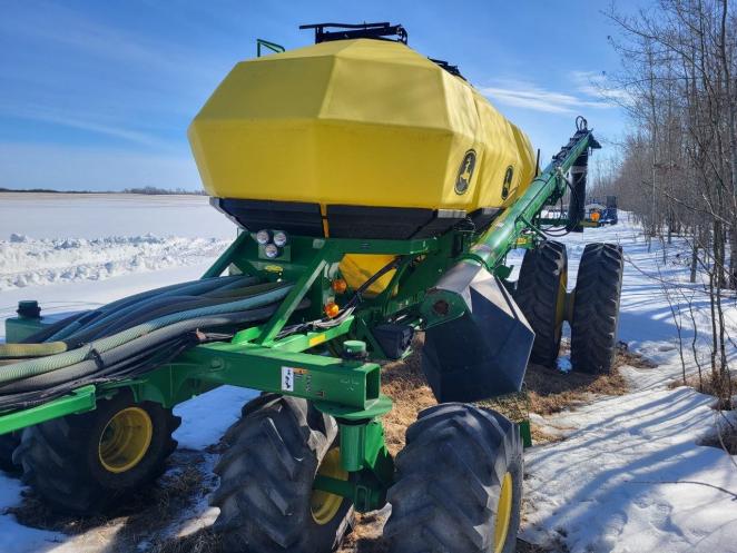 This 2013 Seeding unit has done 17,000 acres, 56' 12" spacing, 3" spread opener, 6 runs, John Deere blockage fertilizer / seed (every line), solid packers, Tow behind cart, 550 bushel (200 - 150 - 200), double shoot with variable rate, hydraulic powerd meters, auger with manual swing, single fan, Goodyear 21.5L-16ISL - 520/85R42, Monitor is a 2630 (could use an upgrade), no camera's, section control (not working), need power beyond, meter rollers (fine, medium and extra course), quick connect being installed, for cart hook-u. putting on 6 Cam locks